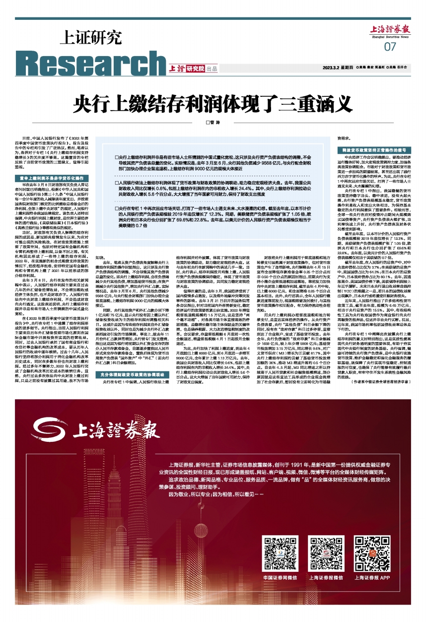 日前,中国人民银行发布了《2022年第四季度中国货币政策执行报告》。报告及报告中的专栏均引发了广泛热议。然而,笔者以为,各界对于专栏1《央行上缴结存利润支持稳增长》的关注度不够高。这篇置首的专栏反映了当前货币政策的三重涵义,值得引起重视。