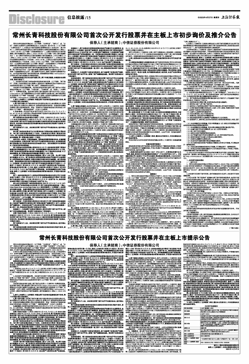 敬请投资者重点关注本次发行流程、网上网下申购及缴款、弃购股份处理等方面,并认真阅读今日刊登的《常州长青科技股份有限公司首次公开发行股票并在主板上市初步询价及推介公告》(以下简称“《初步询价及推介公告》”)。具体内容如下: