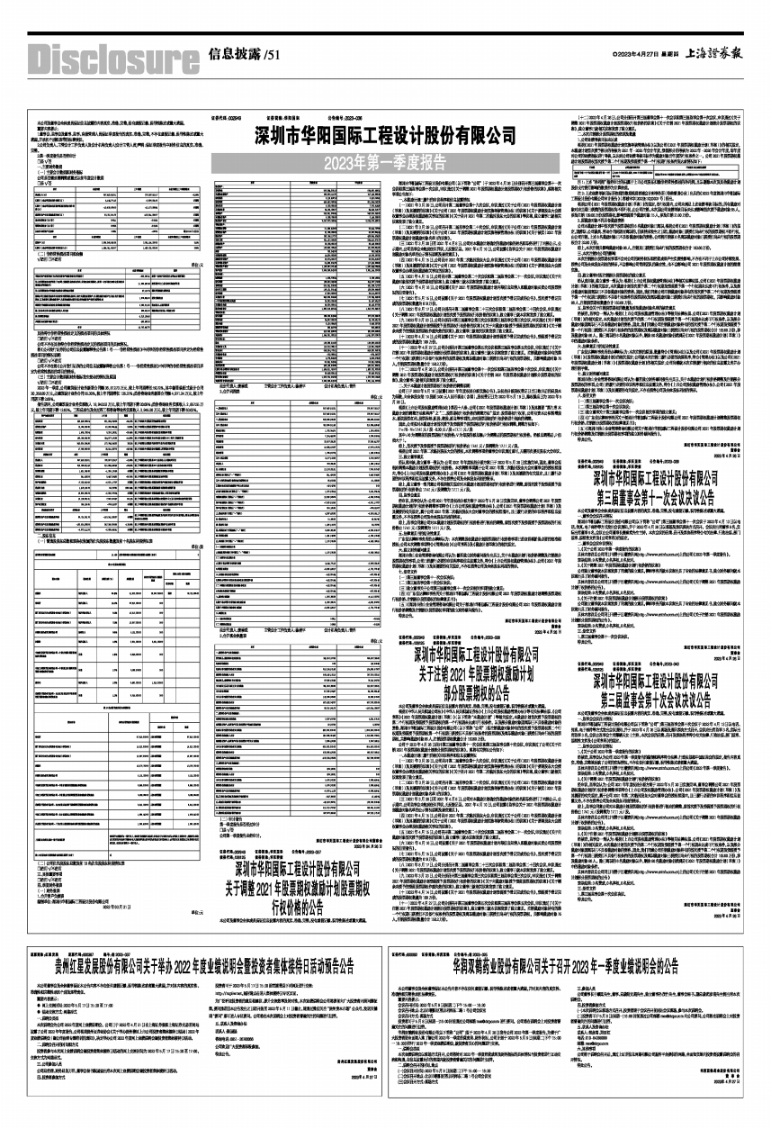 深圳市华阳国际工程设计股份有限公司(以下简称“公司”)第三届董事会第十一次会议于2023年4月13日以电话、传真、电子邮件等方式发出会议通知,并于2023年4月26日以现场及通讯表决方式召开。会议应出席董事9名,实际出席董事9名,会议由公司董事长唐崇武先生主持。本次会议的召集、召开及表决程序符合有关法律、行政法规、部门规章、规范性文件及《公司章程》的规定。