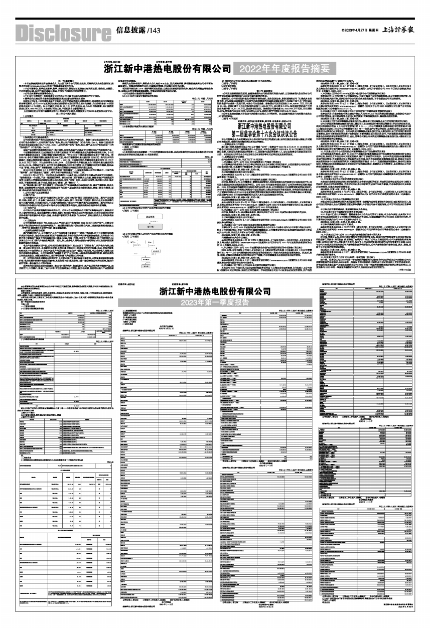 浙江新中港热电股份有限公司(以下简称“公司”)监事会于2023年4月25日11:00时在公司二楼会议室召开公司第二届监事会第十六次会议,本次会议通知于2023年4月15日以通讯方式送达各位监事,本次会议应参加表决的监事3人,实际参与表决的监事3人,会议由监事会主席赵昱东先生主持。本次会议召开符合《公司法》和《公司章程》等有关法律法规及规章的规定。