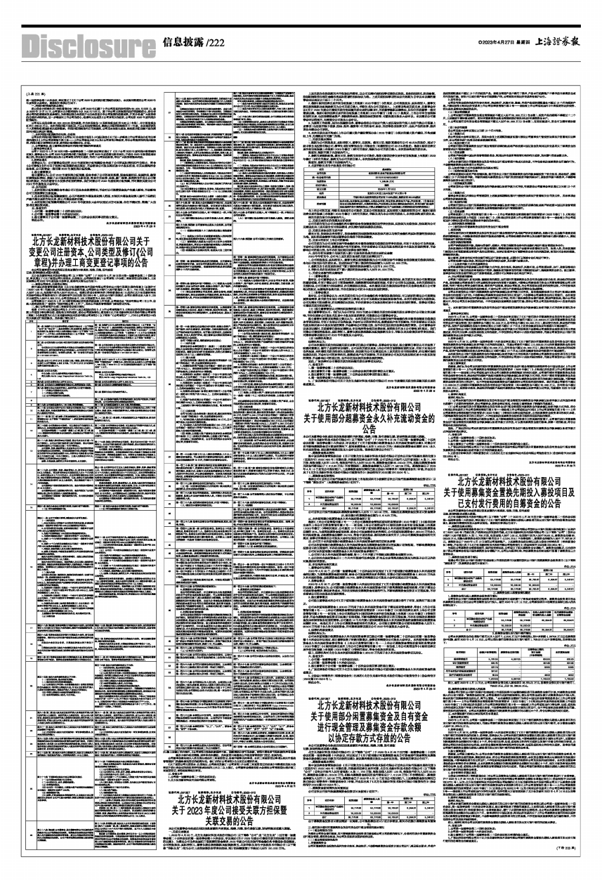 北方长龙新材料技术股份有限公司(以下简称“公司”)于2023年4月26日召开第一届董事会第二十四次会议和第一届监事会第十六次会议,审议通过了《关于使用部分超募资金永久补充流动资金的议案》,同意公司在不影响募集资金项目建设的情况下,使用超募资金人民币2,800.00万元(未超过超募资金总额的30%)永久补充流动资金,该议案尚需提交股东大会审议批准。现将相关事项公告如下: