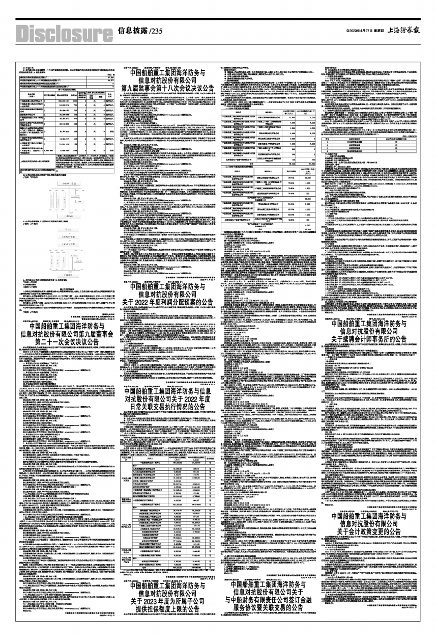 2023年4月25日,中国船舶重工集团海洋防务与信息对抗股份有限公司(以下简称“公司”)第九届董事会第二十一次会议在公司会议室以现场结合通讯方式召开,会议通知及材料及时送达全体董事。本次会议由公司董事长吴传利先生主持,应出席会议董事9名,实际参会董事9名。本次董事会会议的召开符合《中华人民共和国公司法》和《中国船舶重工集团海洋防务与信息对抗股份有限公司章程》的有关规定。本次会议经与会董事的认真讨论,投票表决,形成如下决议: