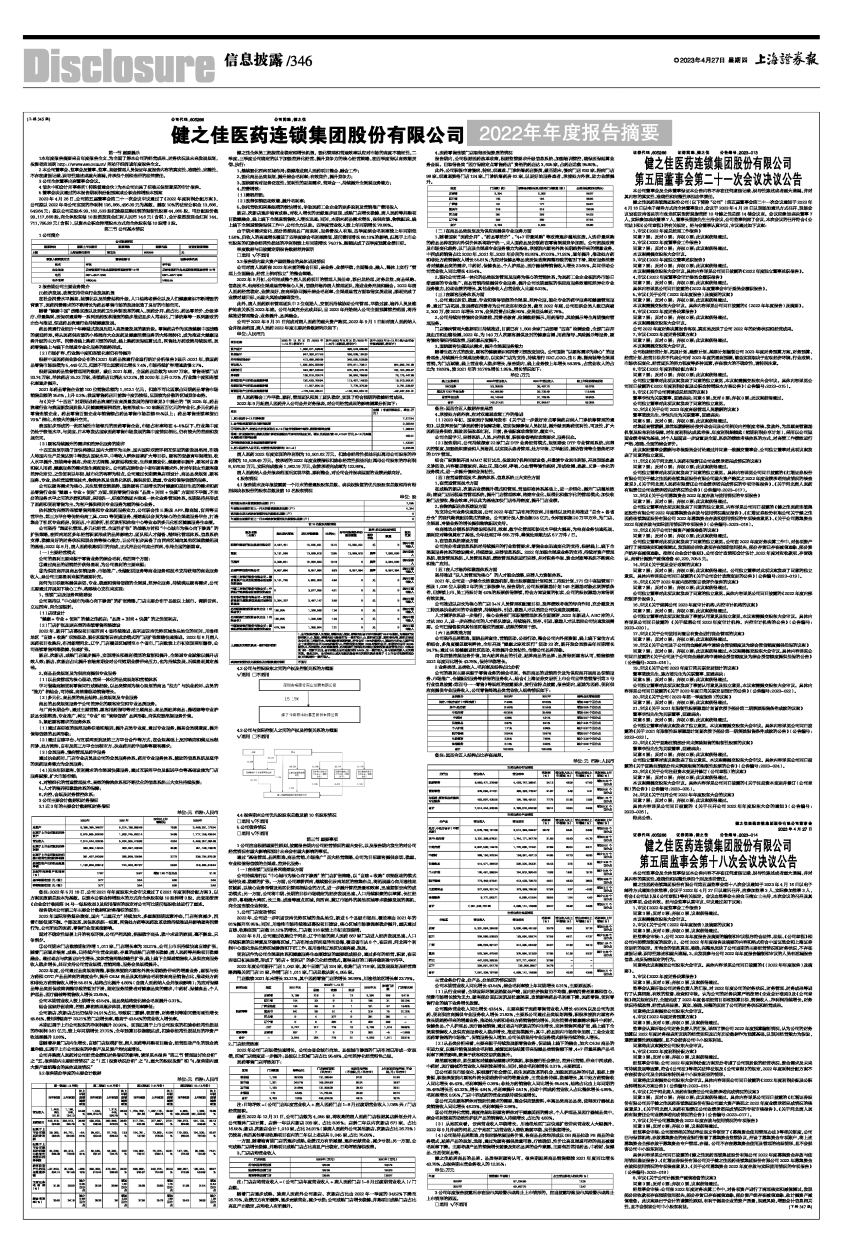 健之佳医药连锁集团股份公司(以下简称“公司”)第五届董事会第二十一次会议通知于2023年4月16日以电子邮件方式向全体董事发出,会议于2023年4月26日以现场加通讯方式召开,现场会议设在云南省昆明市盘龙区联盟街道旗营街10号健之佳总部14楼会议室。会议应参加表决董事7人,实际参加表决董事7人,董事长蓝波先生主持会议,公司监事列席了会议,本次会议的召开符合《公司法》和《公司章程》的有关规定。经与会董事认真审议,审议通过如下议案: