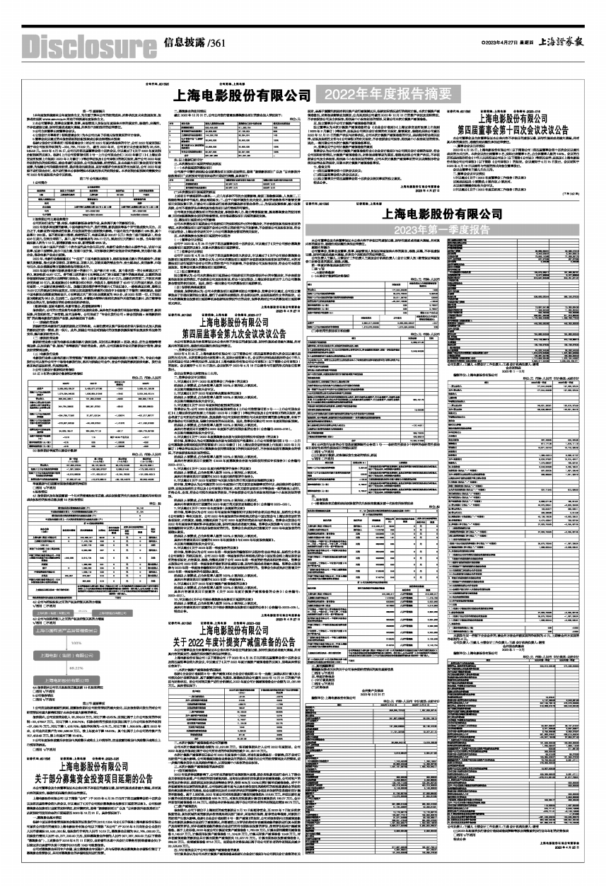 2023年4月25日,上海电影股份有限公司(以下简称公司)第四届董事会第十四次会议以通讯表决的方式召开。本次会议应出席董事9名,实际出席董事9名,占全体董事人数的100%。会议的召开和表决程序符合《中华人民共和国公司法》(以下简称《公司法》)等相关法律、法规及《上海电影股份有限公司公司章程》(以下简称《公司章程》)的规定。会议通知于4月15日发出,会议材料于2023年4月18日以邮件与书面的形式向各位董事发出。