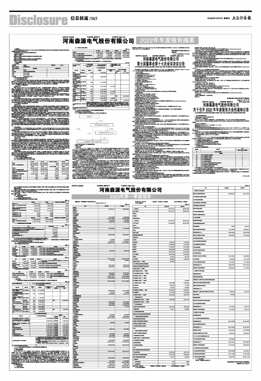 河南森源电气股份有限公司(以下简称“森源电气”或“公司”)第七届董事会第十七次会议于2023年4月26日上午9:30在公司会议室以现场结合通讯的方式召开,现将本次董事会会议情况公告如下: