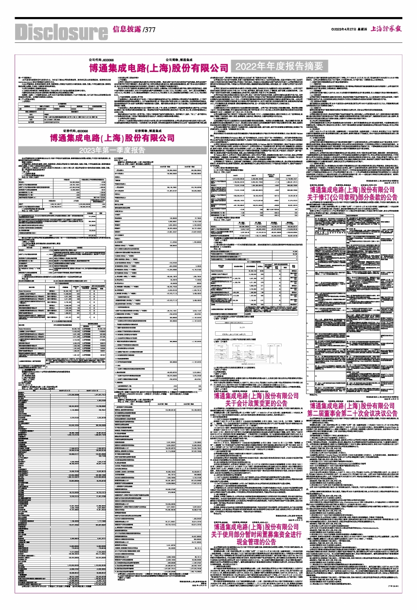 博通集成电路(上海)股份有限公司(以下简称“公司”)第二届董事会第二十次会议于2023年4月26日在公司会议室以现场和通讯相结合的方式举行。会议通知于2023年4月10日以电话方式发出。会议由董事长Pengfei Zhang先生召集并主持,会议应出席董事5人,实际出席董事5人。公司监事、高级管理人员列席了本次会议。会议符合《中华人民共和国公司法》和《博通集成电路(上海)股份有限公司章程》等有关规定。
