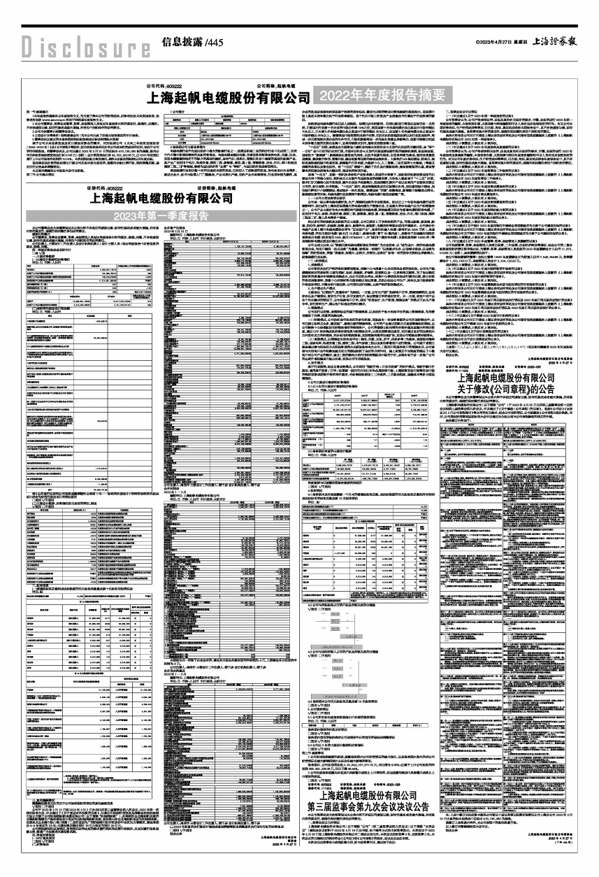 具体内容详见公司同日刊登在上海证券交易所网站及公司指定信息披露媒体上披露的《上海起帆电缆股份有限公司2023年第一季度报告》。