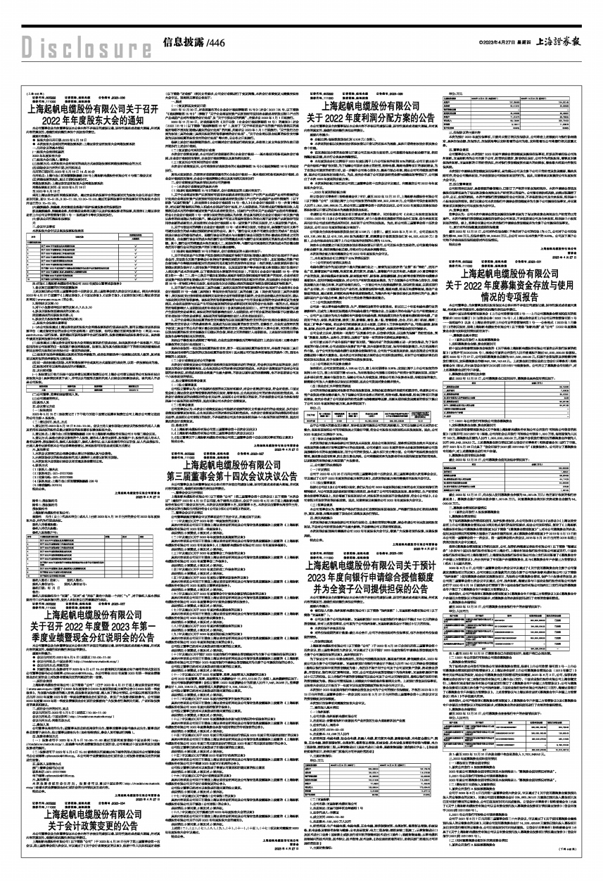 根据中国证券监督管理委员会《上市公司监管指引第2号一一上市公司募集资金管理和使用的监管要求(2022年修订)》(证监会公告〔2022〕15号)、《上海证券交易所上市公司自律监管指引第1号一一规范运作》以及《上海证券交易所上市公司自律监管指南第1号一一公告格式(2023年1月修订)》的相关规定,现将上海起帆电缆股份有限公司(以下简称“起帆电缆”或“公司”)2022年度募集资金存放与实际使用情况说明如下: