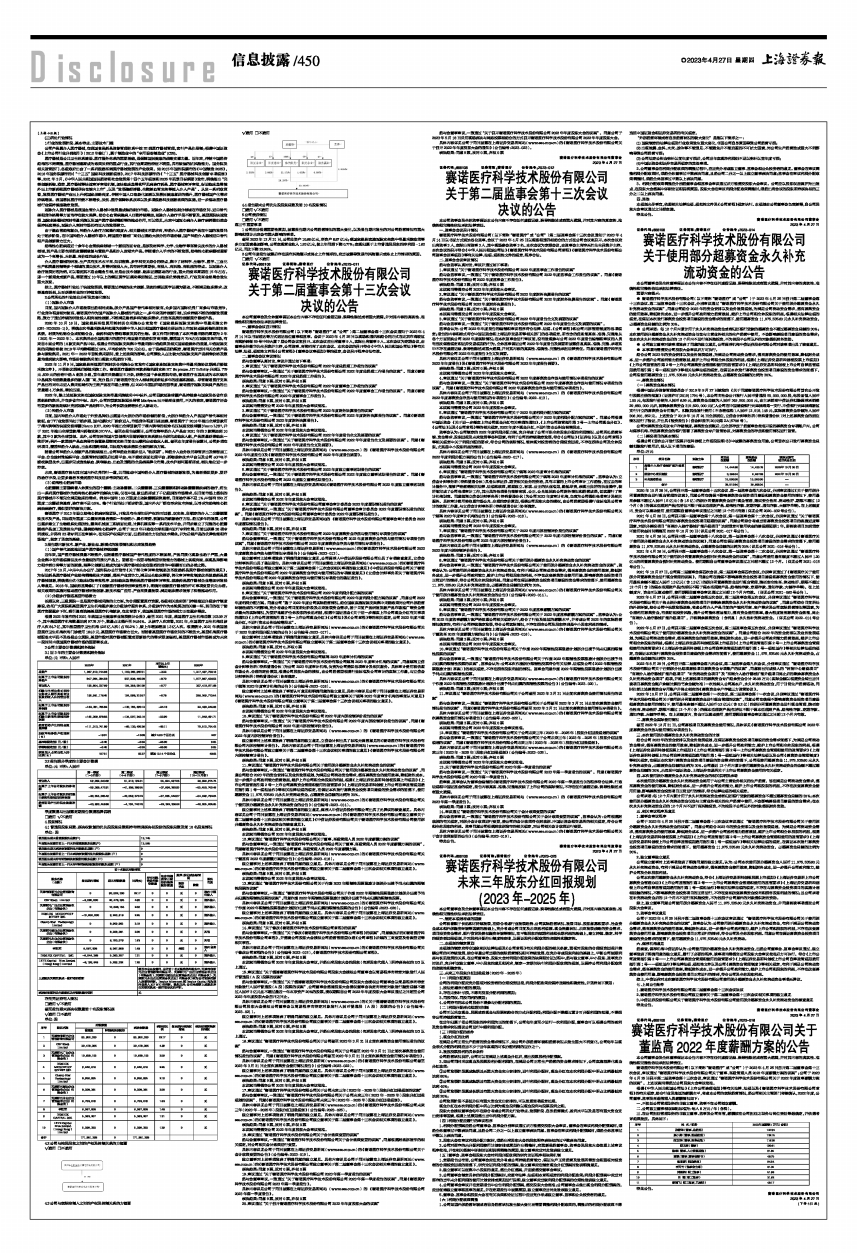 赛诺医疗科学技术股份有限公司(以下简称“赛诺医疗”或“公司”)于2023年4月25日召开第二届董事会第十三次会议,审议通过“赛诺医疗科学技术股份有限公司关于董事、高级管理人员2022年度薪酬方案的议案”;公司于2023年4月25日召开第二届监事会第十三次会议,审议通过“赛诺医疗科学技术股份有限公司关于2022年度监事薪酬方案的议案”。上述议案尚需经过公司股东大会审议批准。