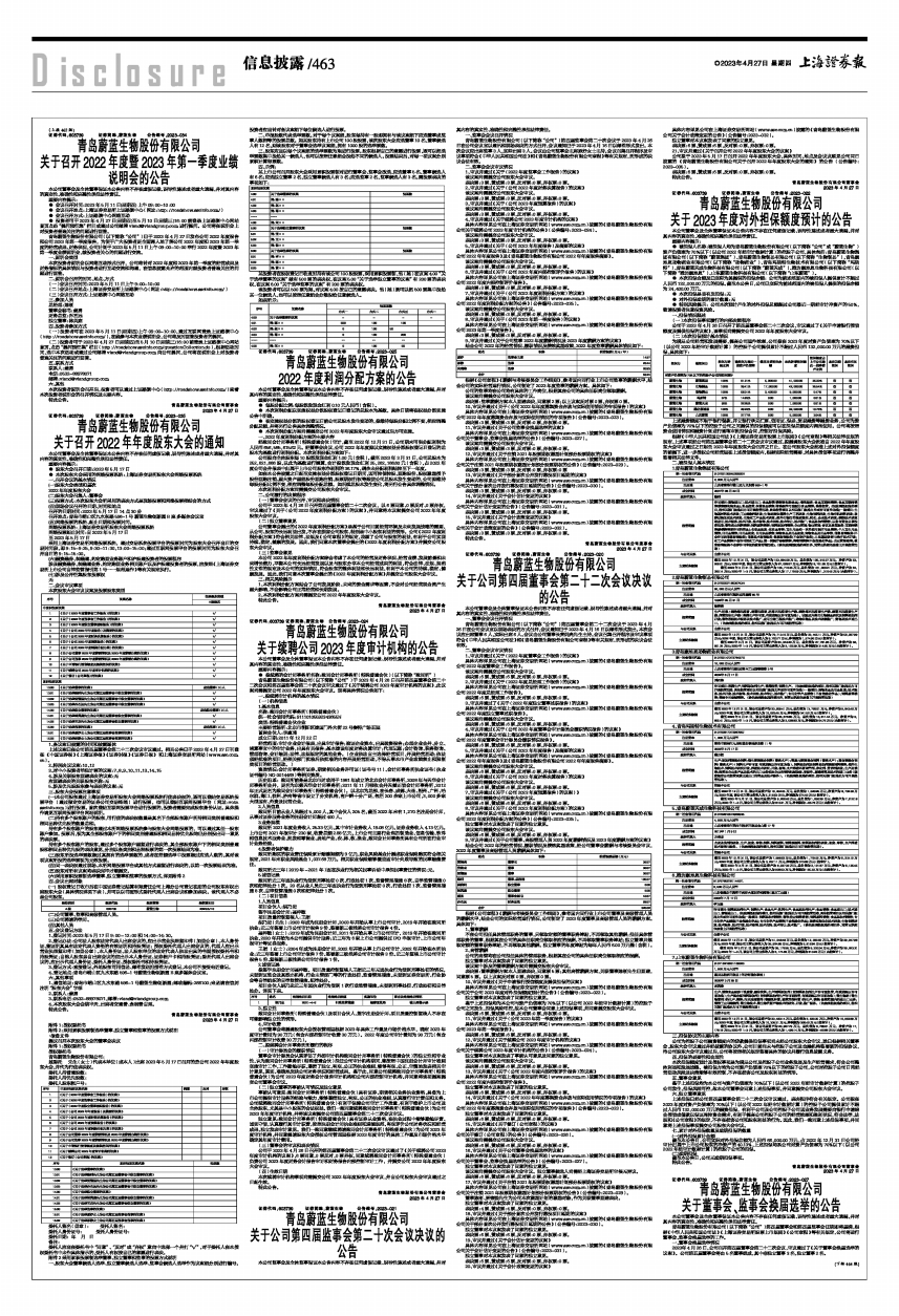 公司拟于2023年5月17日召开2022年年度股东大会,具体时间、地点及会议议题见公司同日披露的《青岛蔚蓝生物股份有限公司关于召开2022年年度股东大会的通知》的公告(公告编号:2023-035)。