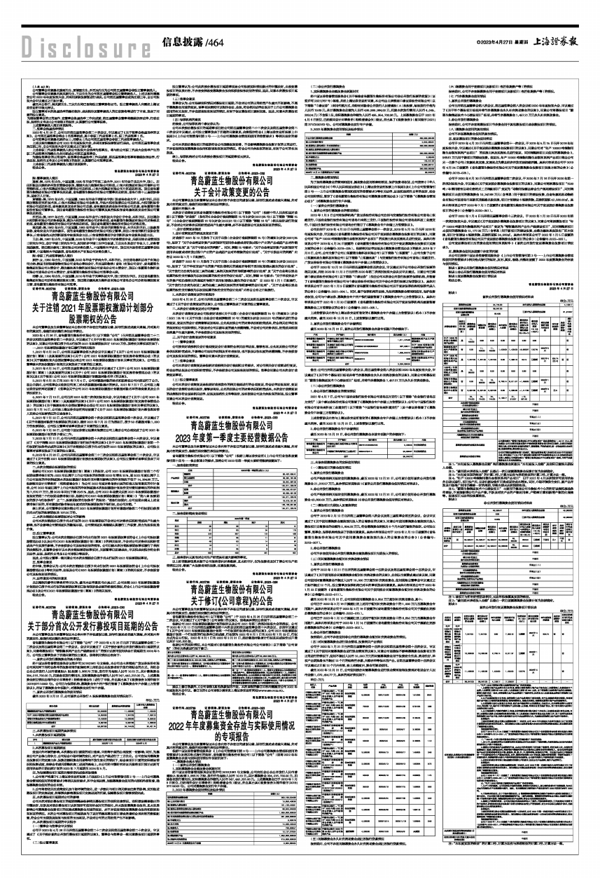 青岛蔚蓝生物股份有限公司(以下简称“公司”)根据上海证券交易所《上市公司行业信息披露指引第十四号一一食品制造》的要求,现将公司2023年第一季度主要经营数据披露如下:
