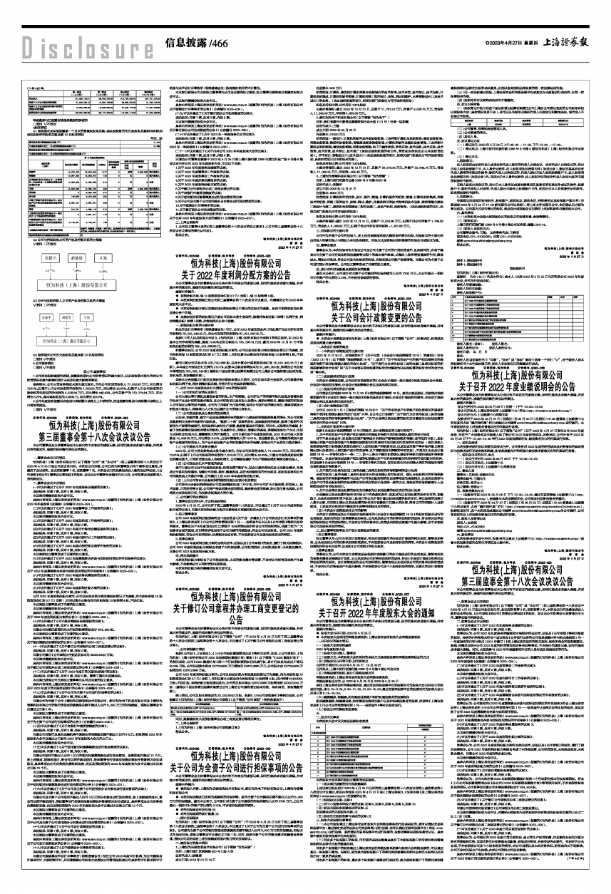 具体内容详见上海证券交易所网站(www.sse.com.cn)披露的《恒为科技(上海)股份有限公司关于2023年度日常关联交易预计的公告》(公告编号2023-029)。(下转467版)