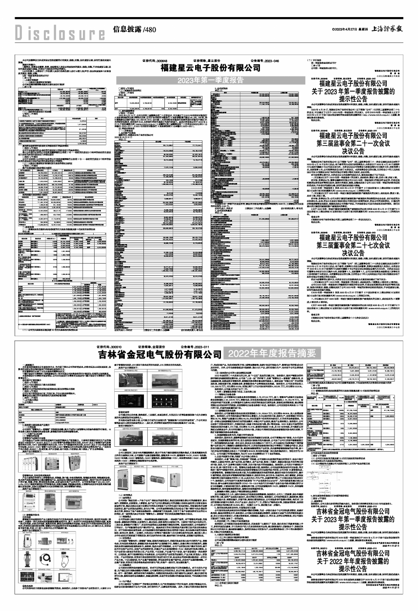 吉林省金冠电气股份有限公司2023年第一季度报告已于2023年4月27日在中国证监会指定的创业板信息披露网站(www.cninfo.com.cn)上披露,请投资者注意查阅。