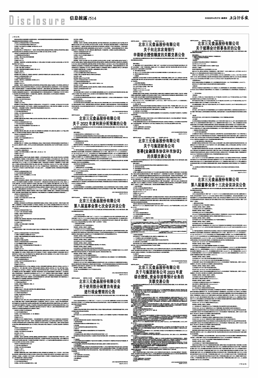 北京三元食品股份有限公司(简称“公司”)于2023年4月25日以现场结合通讯会议的方式召开第八届董事会第十三次会议,本次会议的通知于2023年4月15日以电话、传真和电子邮件方式向全体董事发出。本次会议应参加董事9名,实际参加董事9名。公司全体监事和部分高级管理人员列席了会议。本次会议由公司董事长于永杰先生主持。本次会议的召集、召开及表决程序符合有关法律、行政法规、部门规章、规范性文件及《北京三元食品股份有限公司公司章程》(简称“《公司章程》”)的规定。