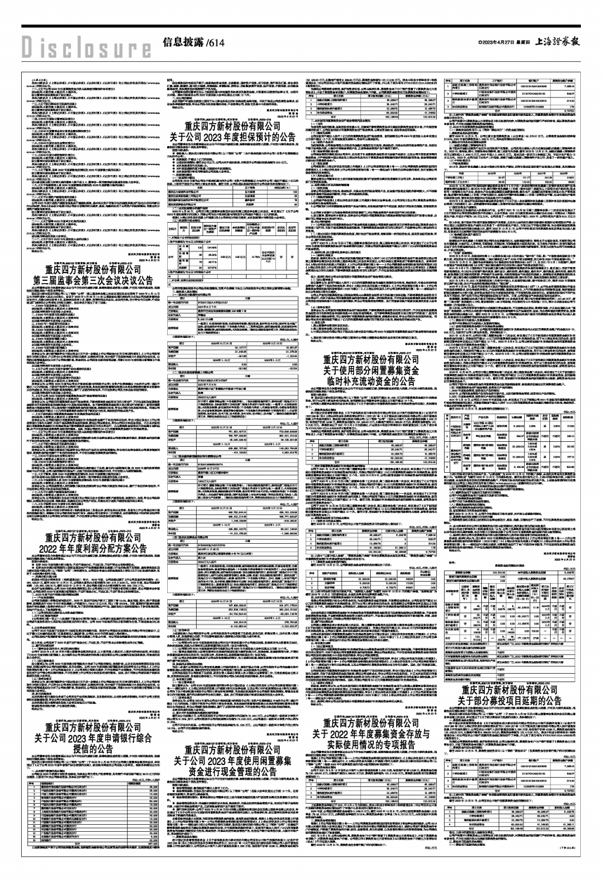 根据《上市公司监管指引第2号一一上市公司募集资金管理和使用的监管要求》、《上海证券交易所上市公司自律监管指引第1号一一规范运作》、《上海证券交易所股票上市规则》等有关规定,重庆四方新材股份有限公司(以下简称“公司”)现将2022年年度募集资金的存放与使用情况专项说明如下: