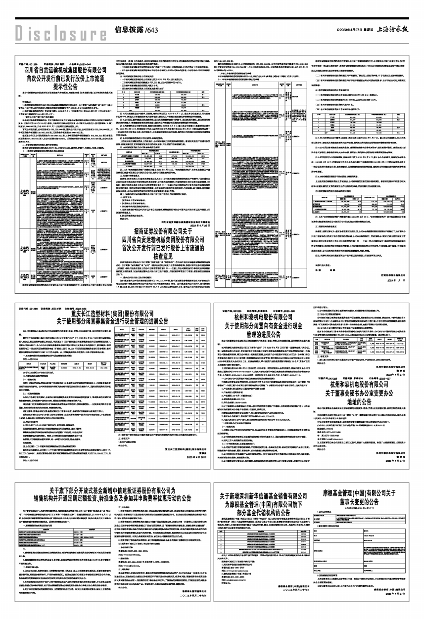 4、招商证券股份有限公司关于四川省自贡运输机械集团股份有限公司首次公开发行前已发行股份上市流通的核查意见;