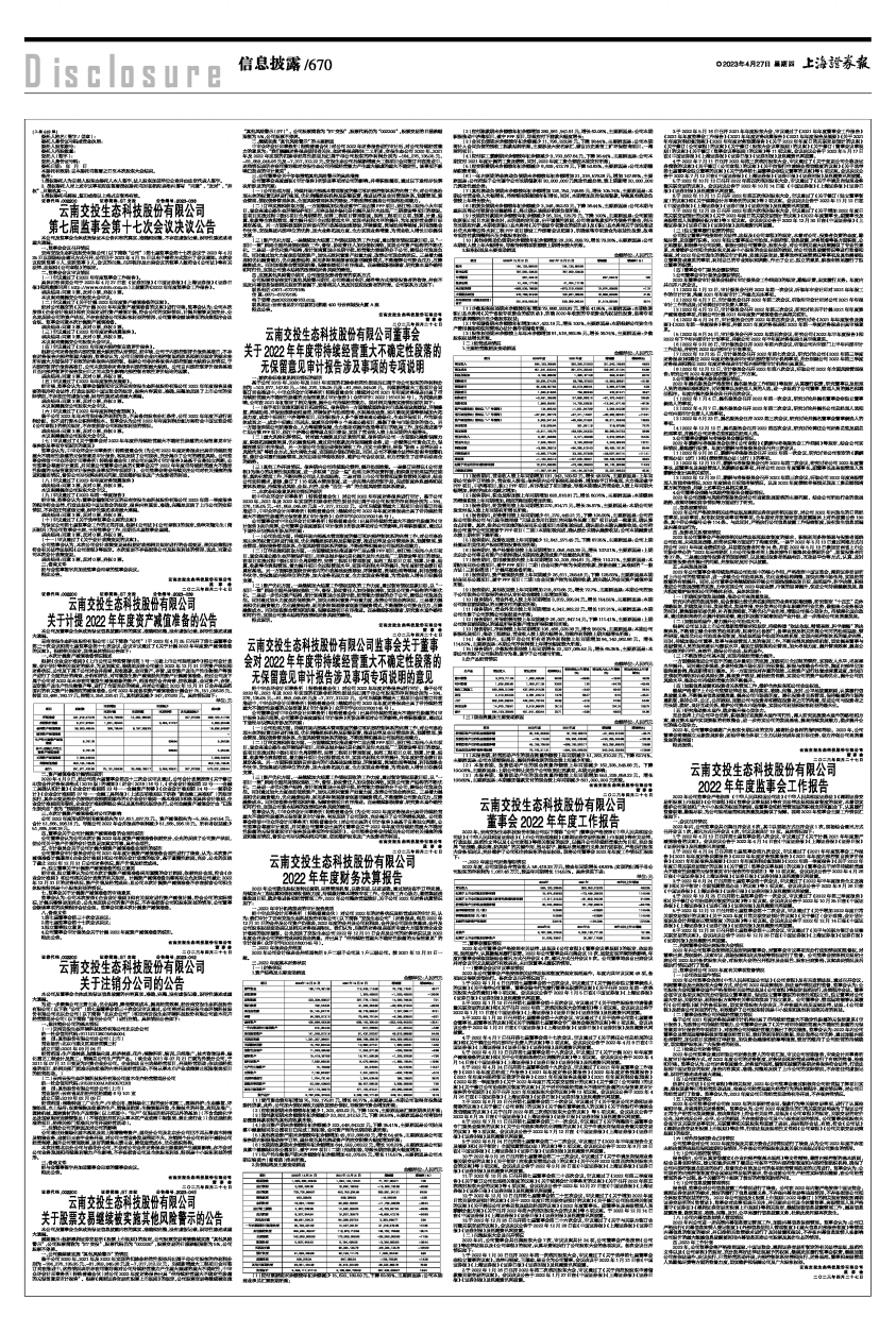 云南交投生态科技股份有限公司(以下简称“公司”)第七届监事会第十七次会议于2023年4月25日以现场结合通讯方式召开,公司已于2023年4月15日以电子邮件方式发出了会议通知。本次会议应到监事3人,实到监事3人,会议的召集、召开程序及出席会议的监事人数符合《公司法》等有关法律、法规和《公司章程》的规定。