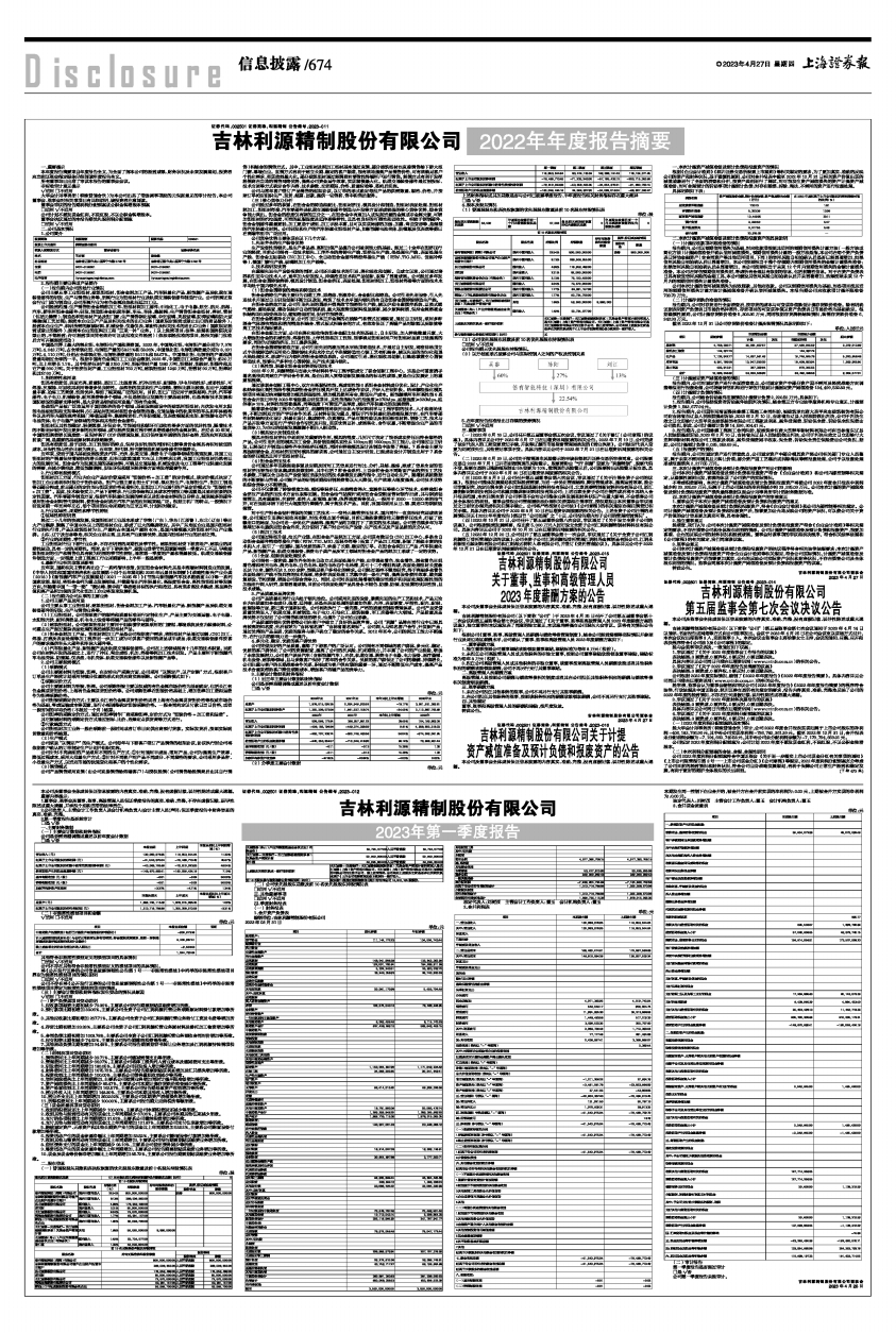 吉林利源精制股份有限公司(以下简称“公司”)第五届监事会第七次会议通知于2023年4月14日以通讯、书面报告或网络等方式向公司监事发出。会议于2023年4月25日在公司会议室以现场方式召开,本次会议应出席监事3人,实到监事3人。本次会议由监事会主席徐黎女士主持,会议的通知、召集、召开和表决程序符合《公司法》及《公司章程》的规定。