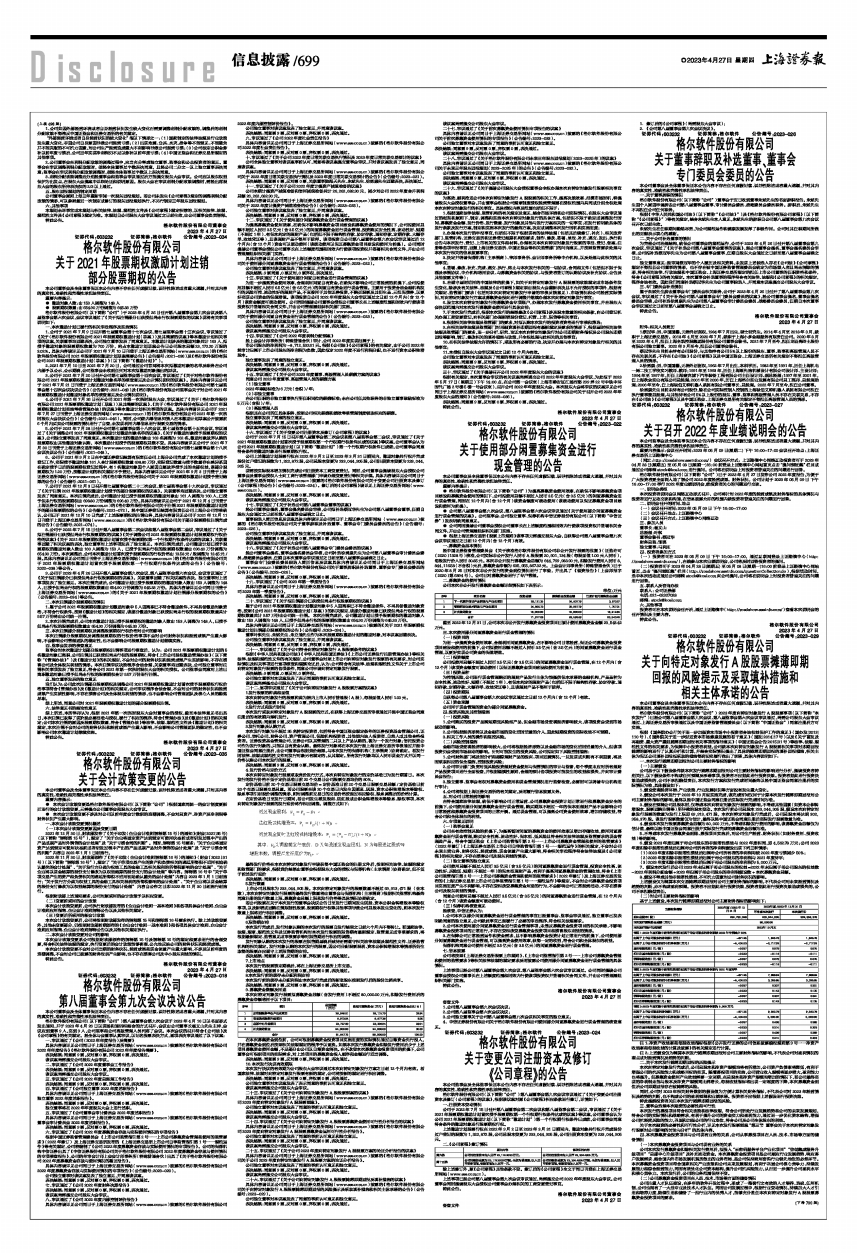 具体内容请详见公司同日于上海证券交易所网站(www.sse.com.cn)披露的《格尔软件股份有限公司2022年年度报告》《格尔软件股份有限公司2022年年度报告摘要》。
