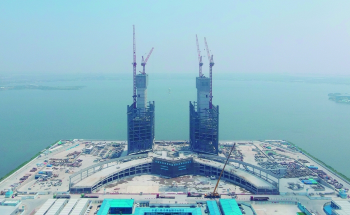 4月27日拍摄的临港西岛中银金融中心项目建设工地(无人机照片)。近日,位于中国(上海)自由贸易试验区临港新片区的中建二局临港西岛中银金融中心南北双塔核心筒高度突破100米,目前项目建设正酣,整体施工稳步推进。临港西岛中银金融中心项目总建筑面积28.25万平方米,建筑主体为南北两座高200米的塔楼,建成后将成为以金融总部办公为主体的大型城市综合体。 新华社图