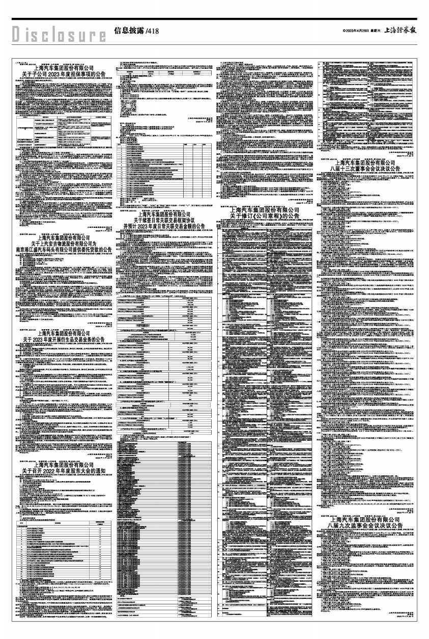 上海汽车集团股份有限公司第八届监事会第九次会议通知于2023年4月14日通过传真、电子邮件等形式送达。本次监事会会议于2023年4月27日采用通讯方式召开,应参加会议监事5人,实际收到5名监事的有效表决票。会议的召集、召开符合《公司法》及《公司章程》的有关规定。