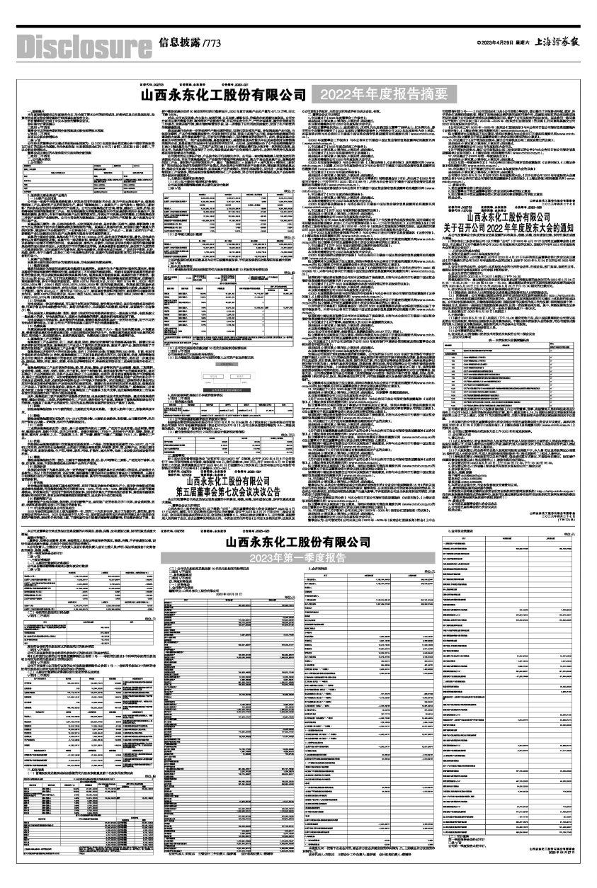 山西永东化工股份有限公司(以下简称“公司”)第五届董事会第七次会议通知于2023年4月17日以电话、邮件、专人送达等形式发出送达全体董事,会议于2023年4月27日在公司二楼会议室召开。会议采用现场表决的形式召开,会议应出席董事9人,实际出席会议董事9人,公司监事、高级管理人员列席了会议,会议由董事长刘东杰主持。本次会议的召开符合《公司法》及相关法律、法规以及《公司章程》的规定,本次会议所形成的有关决议合法、有效。