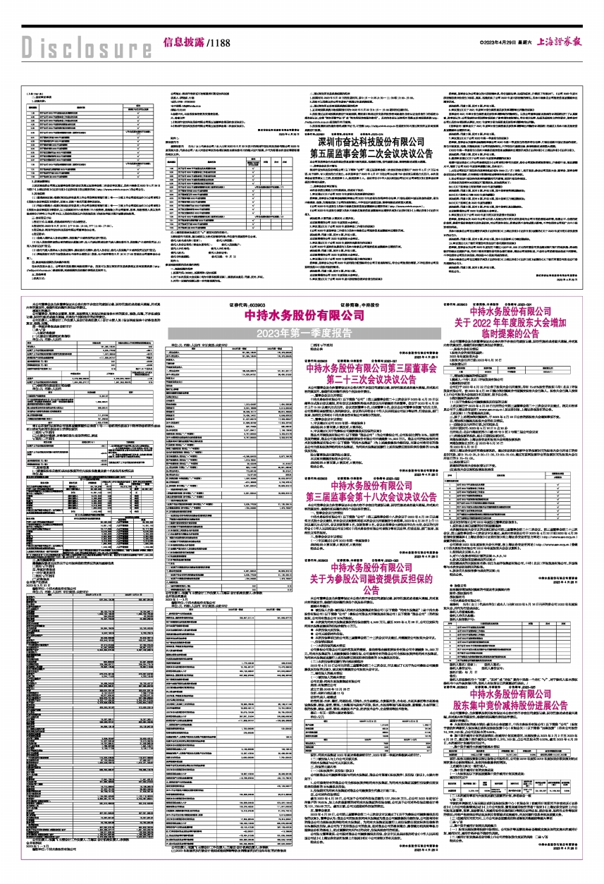 中持水务股份有限公司(以下简称“公司”)第三届监事会第十八次会议于2023年4月28日以邮件方式发出会议通知,所有会议议案资料均在本次会议召开前提交全体监事。2023年4月28日上午11时以通讯方式召开。会议应到监事3名,实到监事3名。会议由监事会主席张克平先生主持,会议的召开符合《中华人民共和国公司法》和《中持水务股份有限公司章程》等有关法律、行政法规、部门规章、规范性文件的规定。