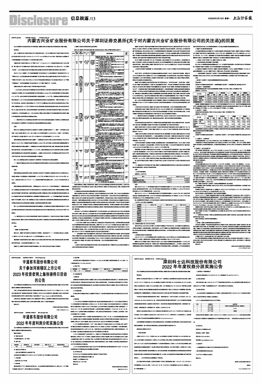 内蒙古兴业矿业股份有限公司(以下简称“公司”)于2023年5月12日收到深圳证券交易所上市公司管理一部下发的《关于对内蒙古兴业矿业股份有限公司的关注函》(公司部关注函〔2023〕第234号)(以下简称“关注函”),公司立即就关注函中的问题展开核查,现根据关注函所涉问题进行说明和答复,具体内容如下: