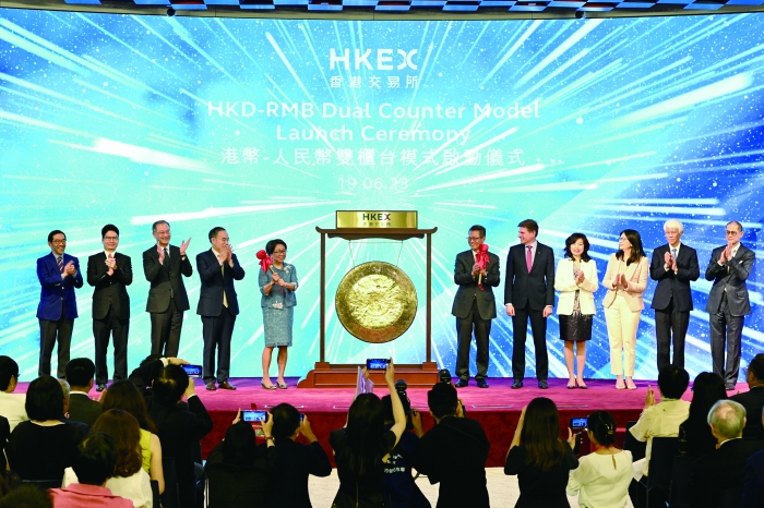 6月19日,“港币-人民币双柜台模式”正式落地。在当日港交所举行的仪式现场,首批双柜台证券的公司代表、做市商、外资机构投资者等汇聚一堂,共同见证港股市场重要的一刻。