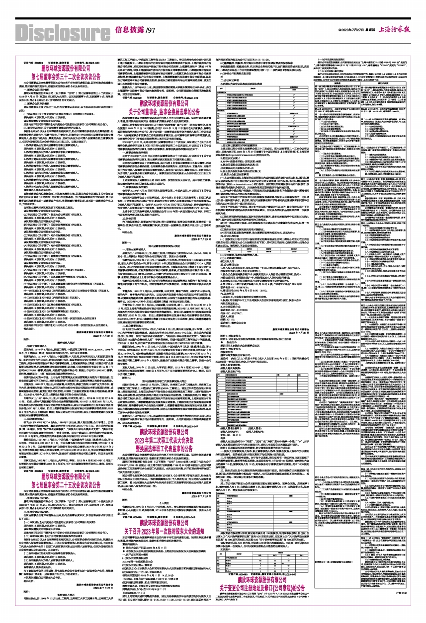 鹏欣环球资源股份有限公司(以下简称“公司”)第七届董事会第三十二次会议于2023年7月26日(星期三)以通讯方式召开。会议应到董事9名,实到董事9名,有效表决票9票,符合《公司法》和《公司章程》的有关规定。
