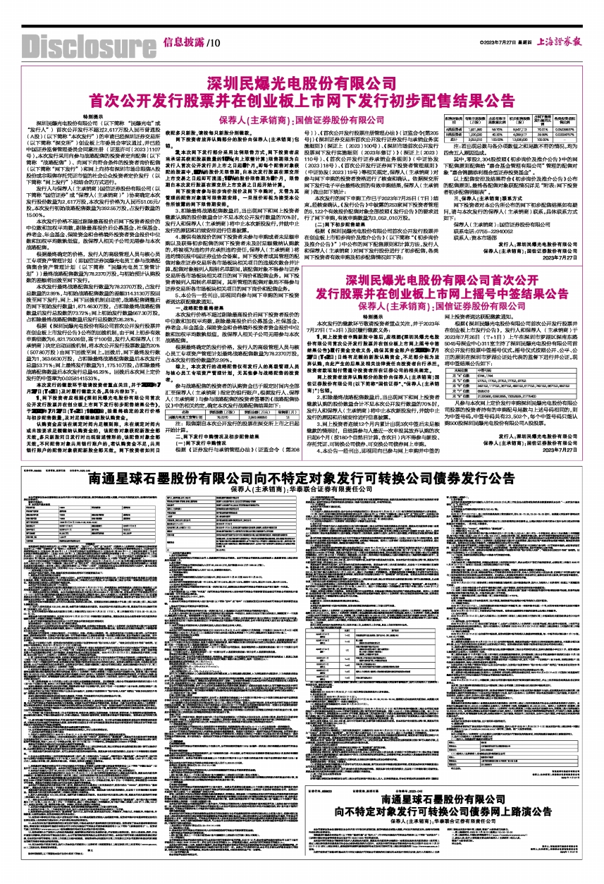 根据《深圳民爆光电股份有限公司首次公开发行股票并在创业板上市发行公告》,发行人和保荐人(主承销商)于2023年7月26日(T+1日)上午在深圳市罗湖区深南东路5045号深业中心311室主持了深圳民爆光电股份有限公司首次公开发行股票中签摇号仪式。摇号仪式按照公开、公平、公正的原则在深圳市罗湖公证处代表的监督下进行并公证。现将中签结果公告如下: