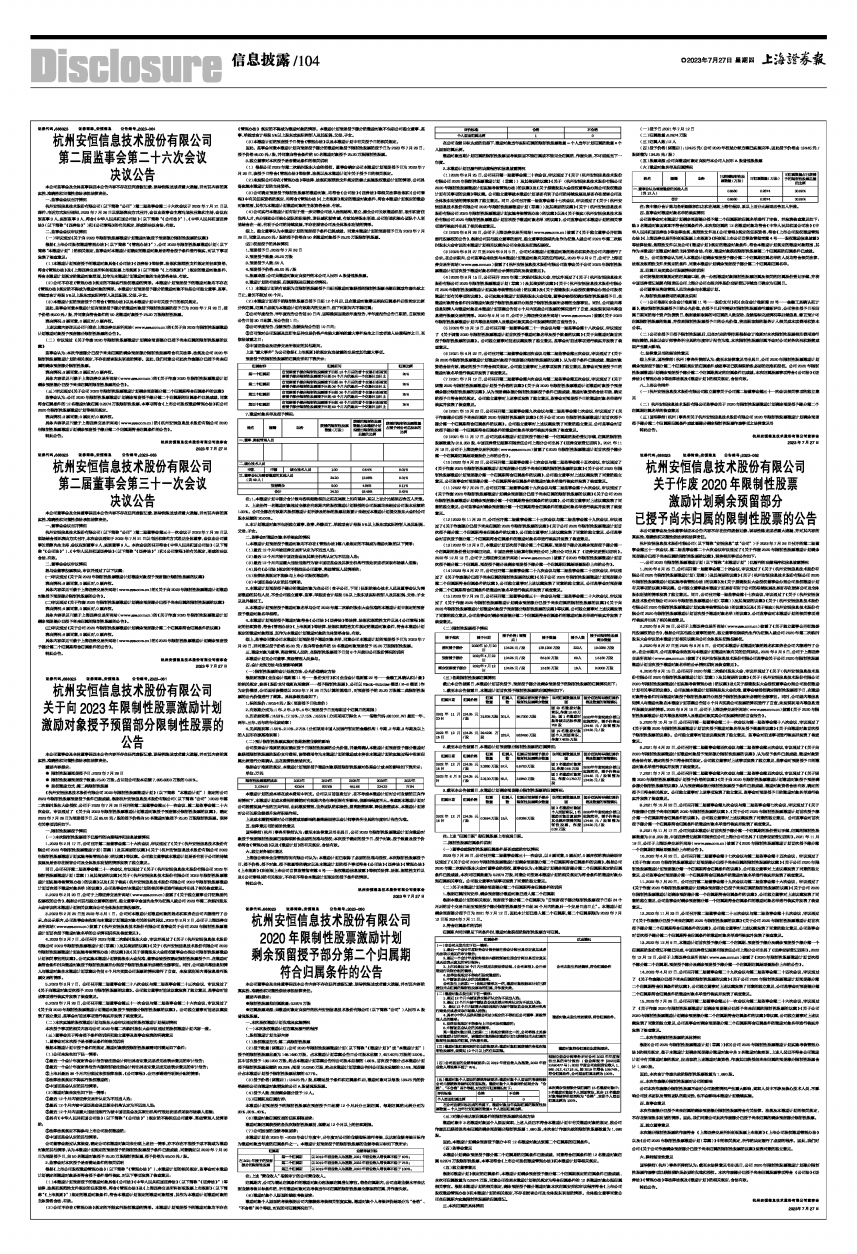 杭州安恒信息技术股份有限公司(以下简称“安恒信息”或“公司”)于2023年7月26日召开的第二届董事会第三十一次会议、第二届监事会第二十六次会议审议通过了《关于作废2020年限制性股票激励计划剩余预留部分已授予尚未归属的限制性股票的议案》,现将相关事项公告如下: