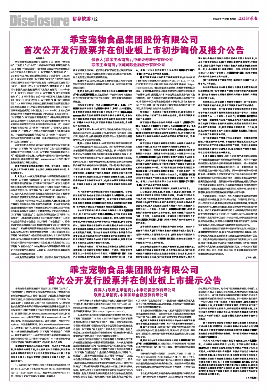 乖宝宠物食品集团股份有限公司(以下简称“发行人”、“乖宝宠物”)首次公开发行股票并在创业板上市申请已经深圳证券交易所(以下简称“深交所”)创业板上市委员会委员审议通过,并已经中国证券监督管理委员会(以下简称“中国证监会”)同意注册(证监许可〔2023〕621号)。《乖宝宠物食品集团股份有限公司首次公开发行股票并在创业板上市招股意向书》及附件披露于中国证券监督管理委员会指定网站(巨潮资讯网,网址www.cninfo.com.cn;中证网,网址www.cs.com.cn;中国证券网,网址www.cnstock.com;证券时报网,网址www.stcn.com;证券日报网,网址www.zqrb.cn;中国金融新闻网,网址www.financialnews.com.cn),并置备于发行人、深交所、本次发行保荐人(联席主承销商)中泰证券股份有限公司(以下简称“中泰证券”、“保荐人(联席主承销商)”)、本次发行联席主承销商中国国际金融股份有限公司(以下简称“中金公司”)(中泰证券和中金公司以下统称“联席主承销商”)的住所,供公众查阅。