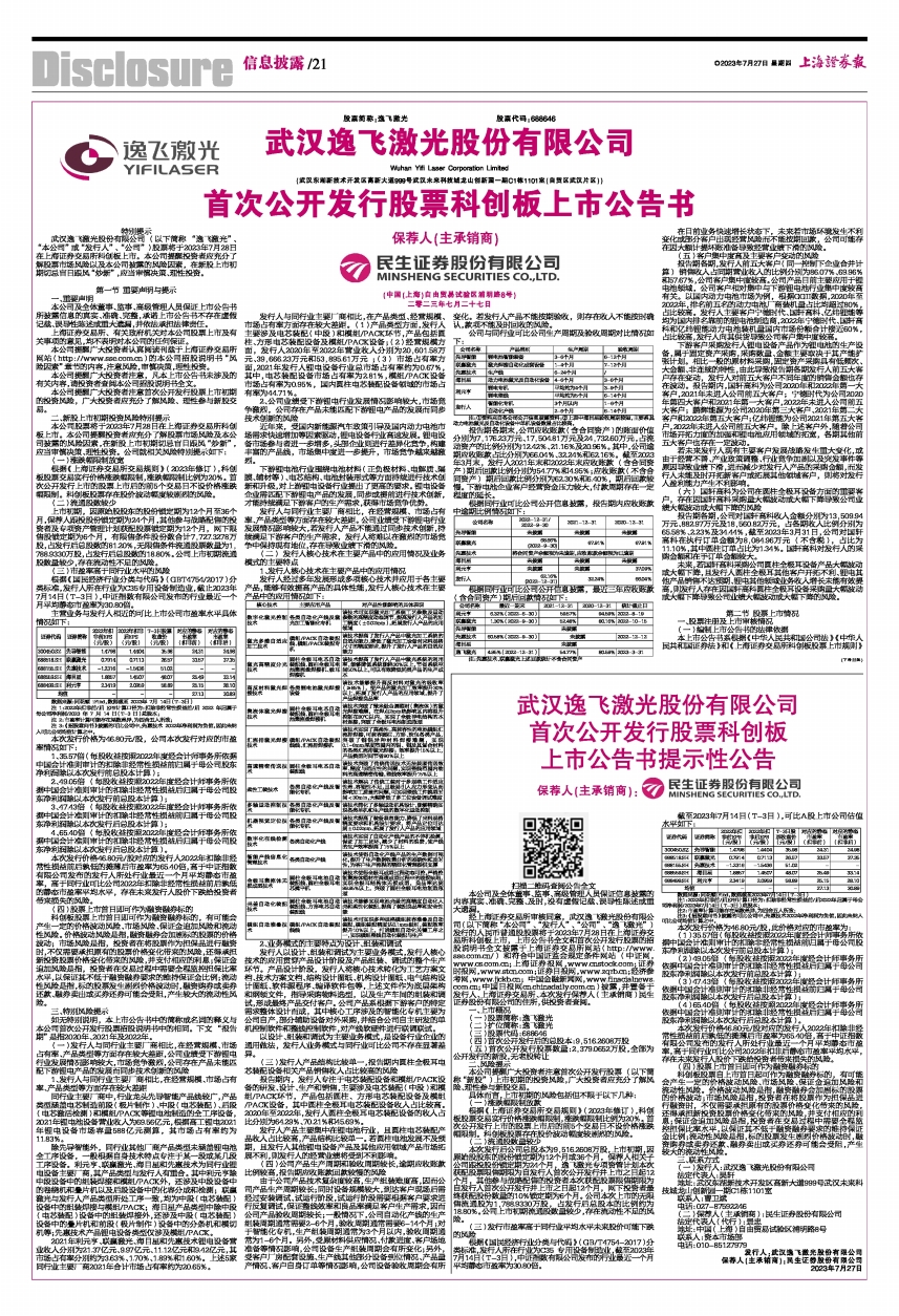 武汉逸飞激光股份有限公司(以下简称“逸飞激光”、“本公司”或“发行人”、“公司”)股票将于2023年7月28日在上海证券交易所科创板上市。本公司提醒投资者应充分了解股票市场风险以及本公司披露的风险因素,在新股上市初期切忌盲目跟风“炒新”,应当审慎决策、理性投资。
