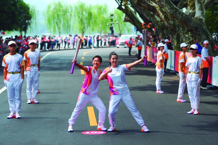 9月8日,火炬手王霜(左)与王沁鸥在火炬传递中。当日,杭州亚运会火炬传递在杭州西湖涌金公园广场启动,共有106棒火炬手参与当日传递。 新华社图