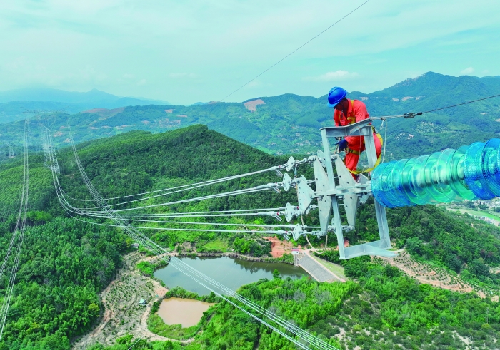 9月13日,福建送变电公司施工人员在线路上作业。当日,在福建省闽侯县,随着福建北电南送特高压交流输变电工程线路工程最后一相导线成功牵引到位,标志着福建北电南送特高压交流输变电线路工程实现全线贯通。福建北电南送特高压交流输变电工程是国家能源局“十四五”规划建设的重点工程,也是福建省第二条特高压线路工程。新华社图