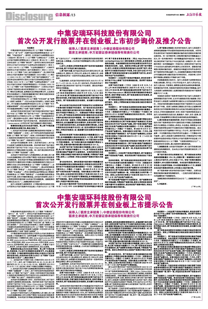 中集安瑞环科技股份有限公司(以下简称“中集环科”、“发行人”或“公司”)根据中国证券监督管理委员会(以下简称“中国证监会”)颁布的《证券发行与承销管理办法》(证监会令〔第208号〕)(以下简称“《承销办法》”)《首次公开发行股票注册管理办法》(证监会令〔第205号〕)、深圳证券交易所(以下简称“深交所”)发布的《深圳证券交易所首次公开发行证券发行与承销业务实施细则》(深证上〔2023〕100号)(以下简称“《业务实施细则》”)《深圳市场首次公开发行股票网上发行实施细则》(深证上〔2018〕279号)(以下简称“《网上发行实施细则》”)及《深圳市场首次公开发行股票网下发行实施细则(2023年修订)》(深证上〔2023〕110号)(以下简称“《网下发行实施细则》”)、中国证券业协会颁布的《首次公开发行证券承销业务规则》(中证协发〔2023〕18号)(以下简称“《承销业务规则》”)《首次公开发行证券网下投资者管理规则》(中证协发〔2023〕19号)(以下简称“《网下投资者管理规则》”)《首次公开发行证券网下投资者分类评价和管理指引》(中证协发〔2023〕19号)等相关法律法规、监管规定及自律规则等文件,以及深交所有关股票发行上市规则和最新操作指引等有关规定组织实施首次公开发行股票并在创业板上市。