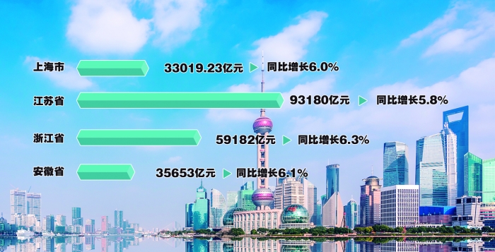 其中,上海市实现地区生产总值33019.23亿元,按可比价格计算,同比增长6.0%;江苏省实现生产总值93180亿元,同比增长5.8%;浙江省生产总值59182亿元,按不变价格计算,同比增长6.3%;安徽省生产总值35653亿元,按不变价格计算,同比增长6.1%。