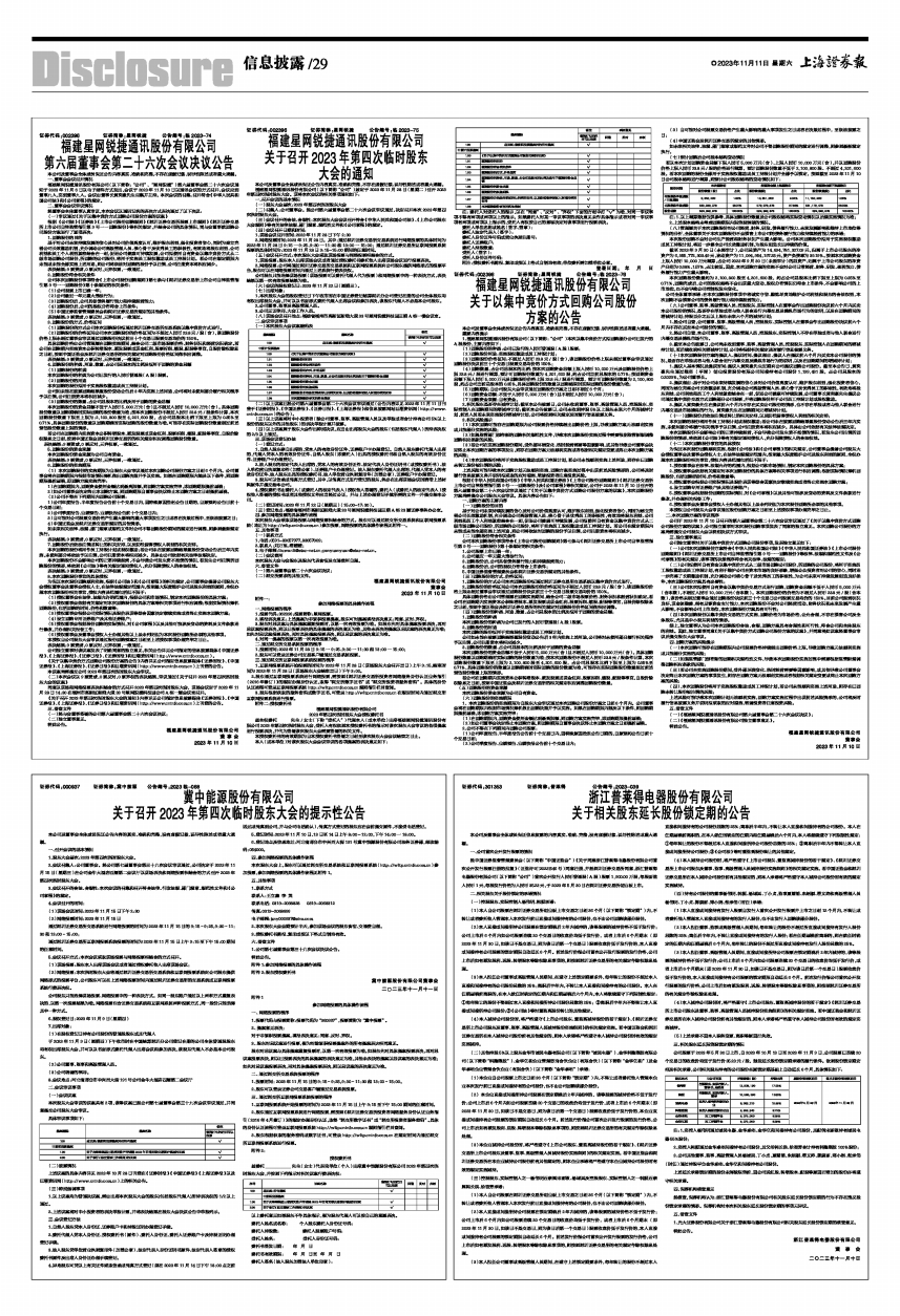 福建星网锐捷通讯股份有限公司(以下简称“公司”)兹定于2023年11月28日(星期二)召开2023年第四次临时股东大会。现将本次会议的相关事项通知如下: