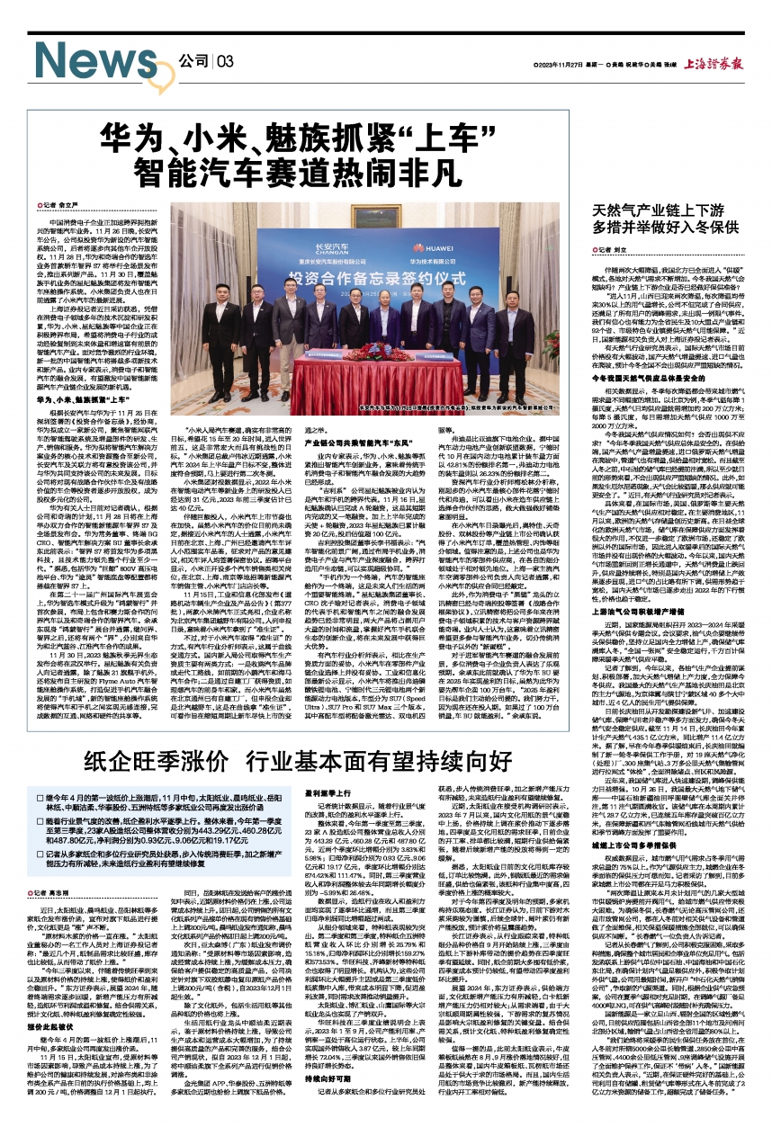11月15日,太阳纸业宣布,受原材料等市场因素影响,导致产品成本持续上涨,为了维护公司的健康和持续发展,对涂布类和非涂布类全系产品在目前的执行价格基础上,均上调200元/吨,价格调整自12月1日起执行。