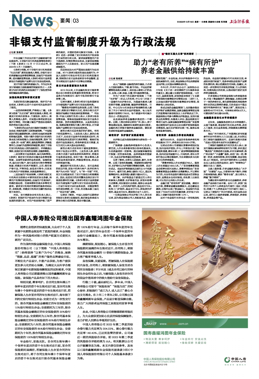 行稳二十载,盛启新纪元。多年来,中国人寿寿险公司坚守“保险姓保”“保险为民”的初心使命,积极践行“成己为人 成人达己”核心企业文化理念。在上市二十周年之际,公司推出国寿鑫耀鸿图年金保险,产品设计彰显保障功能,助力广大消费者运用保险工具规划和安享幸福人生。