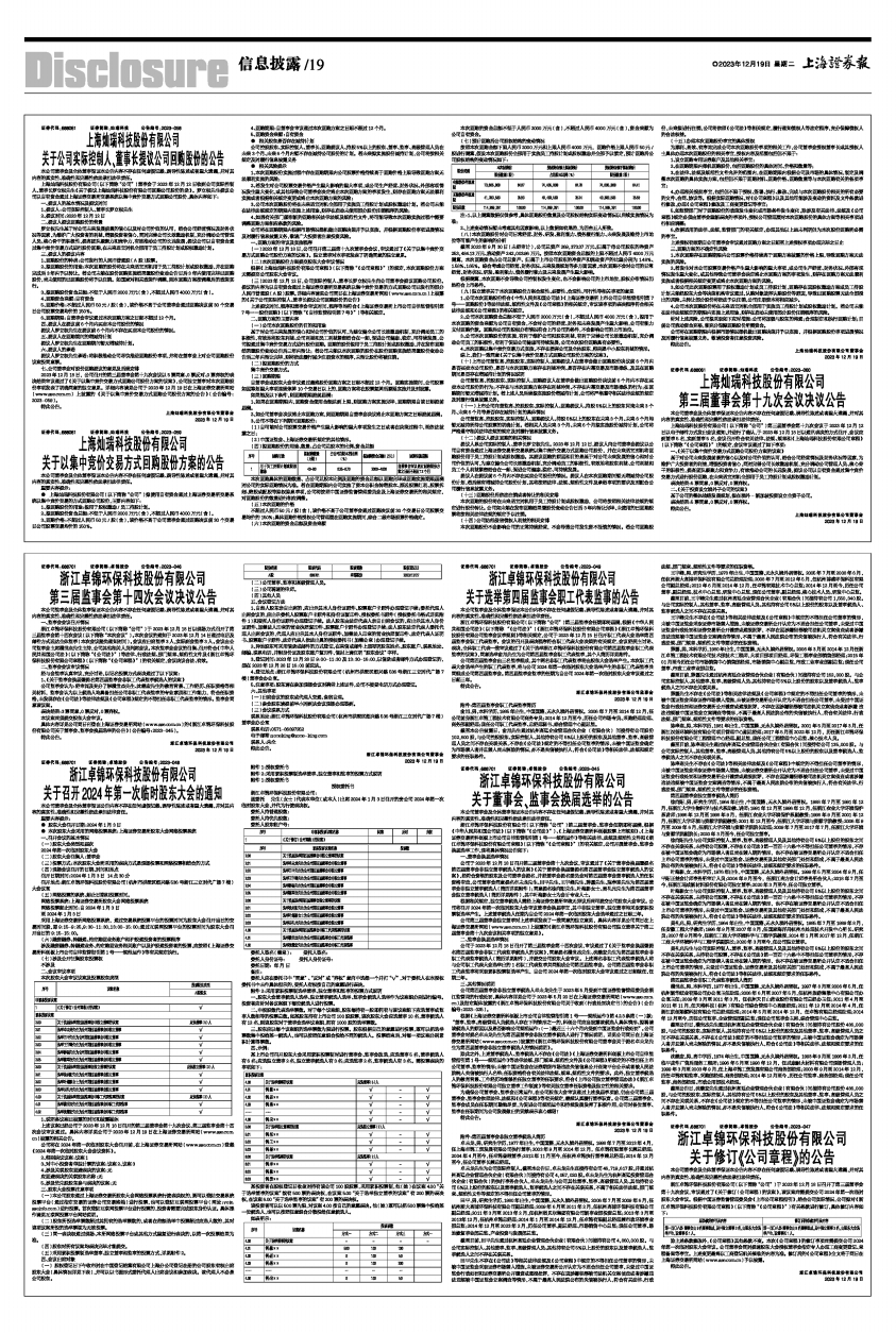 浙江卓锦环保科技股份有限公司(以下简称“公司”)第三届董事会、监事会任期即将届满,根据《中华人民共和国公司法》(以下简称“《公司法》”)、《上海证券交易所科创板股票上市规则》、《上海证券交易所科创板上市公司自律监管指引第1号一一规范运作》等相关法律、法规及规范性文件和《浙江卓锦环保科技股份有限公司章程》(以下简称“《公司章程》”)的有关规定,公司开展董事会、监事会换届选举工作,现将具体情况公告如下: