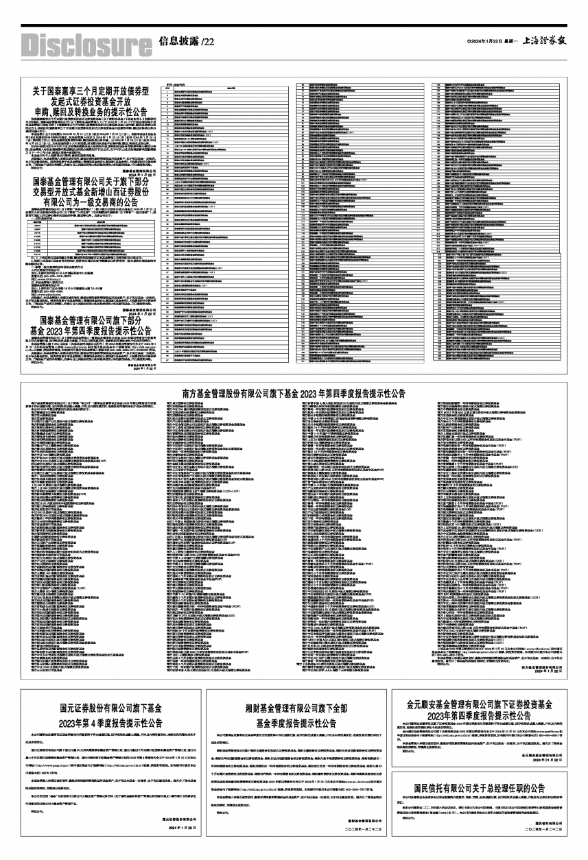 国元证券股份有限公司旗下国元元赢30天持有期债券型集合资产管理计划、国元元赢四个月定期开放债券型集合资产管理计划、国元元赢六个月定期开放债券型集合资产管理计划、国元元增利货币型集合资产管理计划的2023年第4季度报告全文于2024年1月22日在本公司网站(http://www.gyzq.com.cn)和中国证监会电子披露网站(http://eid.csrc.gov.cn/fund)披露,供投资者查阅。如有疑问可拨打本公司客服电话(95578)咨询。
