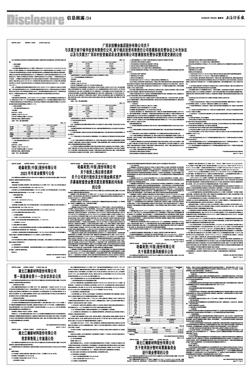 七、截至2024年1月24日,公司股价剔除大盘和板块整体因素后的实际波动幅度较大。公司股票连续7个交易日涨停,累计涨幅达到95.02%,累计偏离上证指数97.31%。公司股票最新动态市盈率-6,022.02,大幅高于同行业可比公司动态市盈率。2024年1月23日、1月24日,公司股票换手率大幅增加,分别达到18.98%、10.30%,敬请广大投资者注意二级市场交易风险,理性决策,审慎投资。