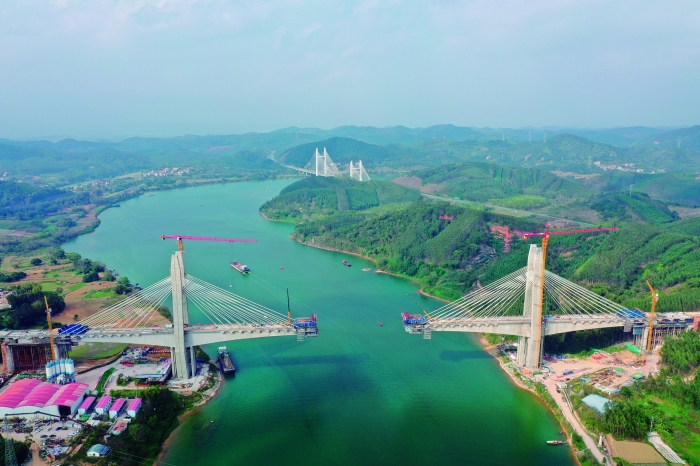 2月21日拍摄的南深高铁南玉段六律邕江特大桥建设现场。当日,在广西南宁,南深高铁南玉段六律邕江特大桥建设现场一片繁忙,建设者加紧施工推进进度,力争项目早日建成。据介绍,南深高铁南玉段项目是广西自主投资建设的第一条时速350公里的高速铁路,西起南宁市,向东经贵港市进入玉林市。项目建成通车后,南宁至玉林行程将由2小时缩短至50分钟左右。六律邕江特大桥主跨320米,是南深高铁南玉段的重点控制性工程。新华社图