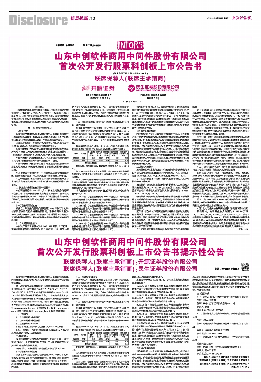 经上海证券交易所审核同意,山东中创软件商用中间件股份有限公司(以下简称“本公司”、“发行人”、“公司”、“中创股份”)发行的人民币普通股股票将于2024年3月13日在上海证券交易所科创板上市,上市公告书全文和首次公开发行股票的招股说明书全文披露于上海证券交易所网站(http://www.sse.com.cn/)和符合中国证监会规定条件网站(中证网,网址:www.cs.com.cn;中国证券网,网址:www.cnstock.com;证券时报网,网址:www.stcn.com;证券日报网,网址:www.zqrb.cn),供投资者查阅。