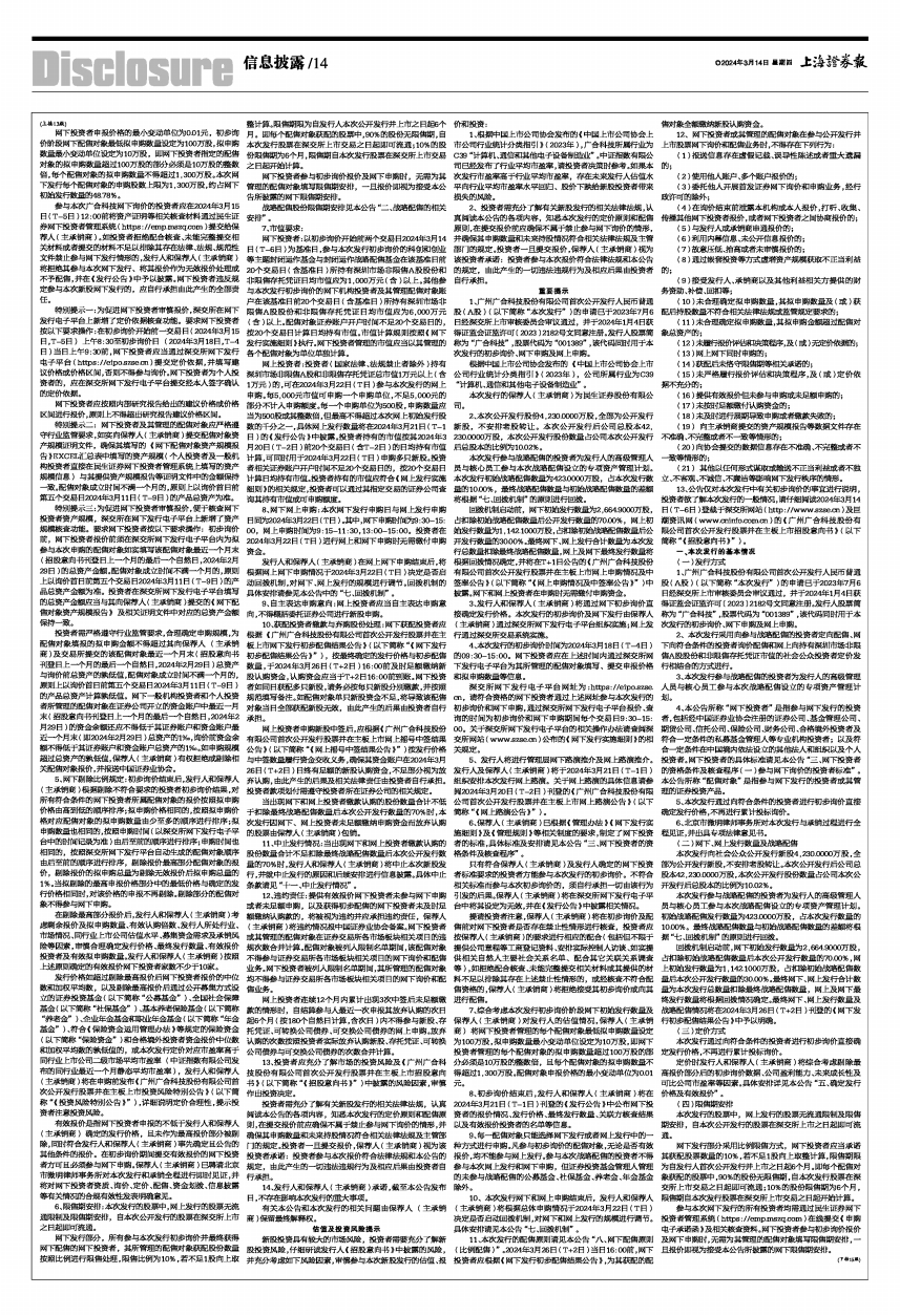 13、公告仅对本次发行中有关初步询价的事宜进行说明,投资者欲了解本次发行的一般情况,请仔细阅读2024年3月14日(T-6日)登载于深交所网站(http://www.szse.cn)及巨潮资讯网(www.cninfo.com.cn)的《广州广合科技股份有限公司首次公开发行股票并在主板上市招股意向书》(以下简称“《招股意向书》”)。