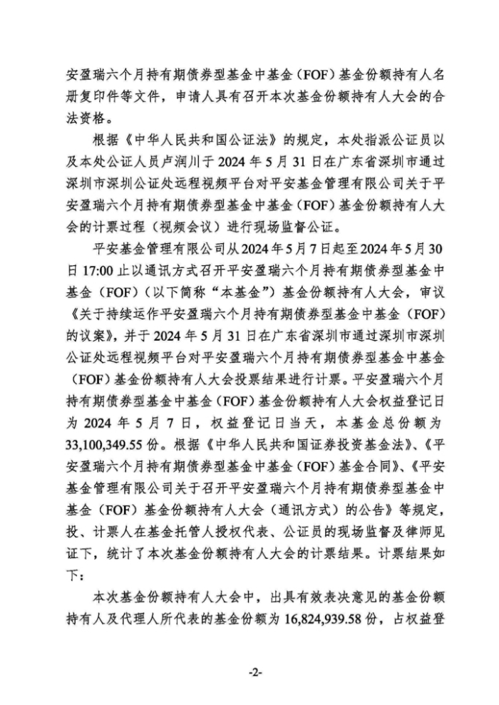 4、《深圳市深圳公证处关于平安盈瑞六个月持有期债券型基金中基金(FOF)基金份额持有人大会的公证书》