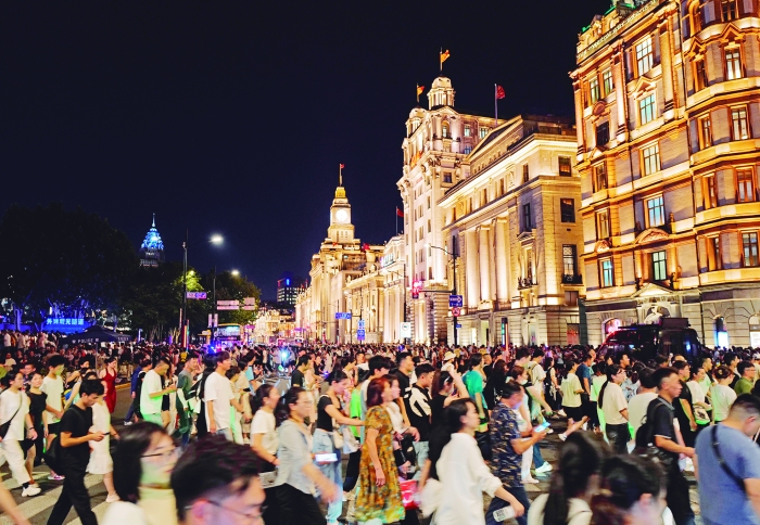 暑期,上海城市夜游热度持续攀升。夜幕降临后,外滩、南京路、新天地等地游人如织,部分景点也推出了主题夜游、夜场项目等吸引游客。图为上海外滩游人如织。新华社图
