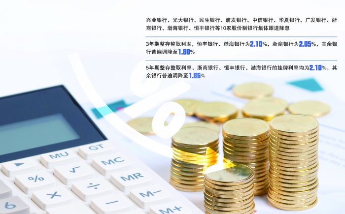 继国有大行和招商银行、平安银行两家股份制银行后,又有10家股份制银行集体宣布降息。调整后的3年期整存整取利率,恒丰银行、渤海银行为2.10%,浙商银行为2.05%,其余银行普遍调降至1.80%;5年期整存整取利率,浙商银行、恒丰银行、渤海银行均为2.10%,其余银行普遍调降至1.85%。